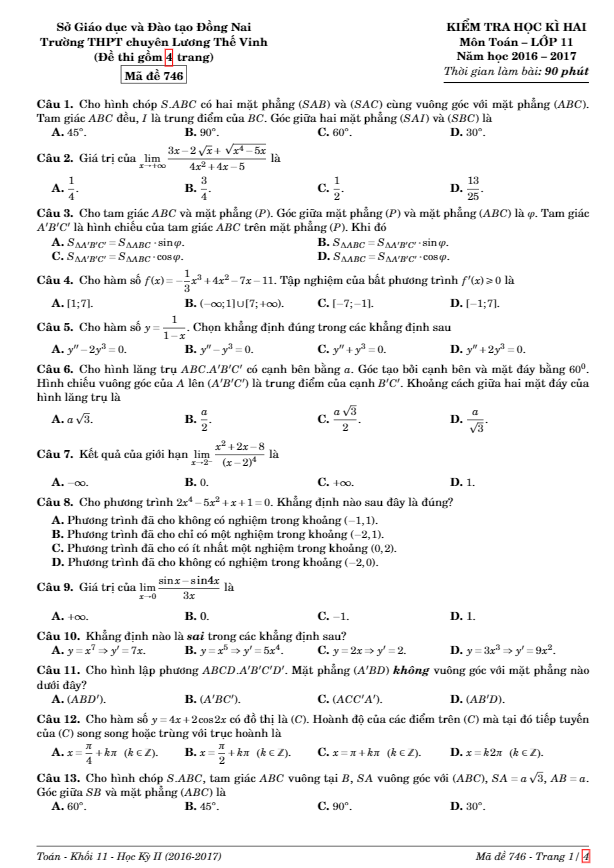 Đề thi HK2 Toán 11 năm học 2016 – 2017 trường THPT chuyên Lương Thế Vinh – Đồng Nai
