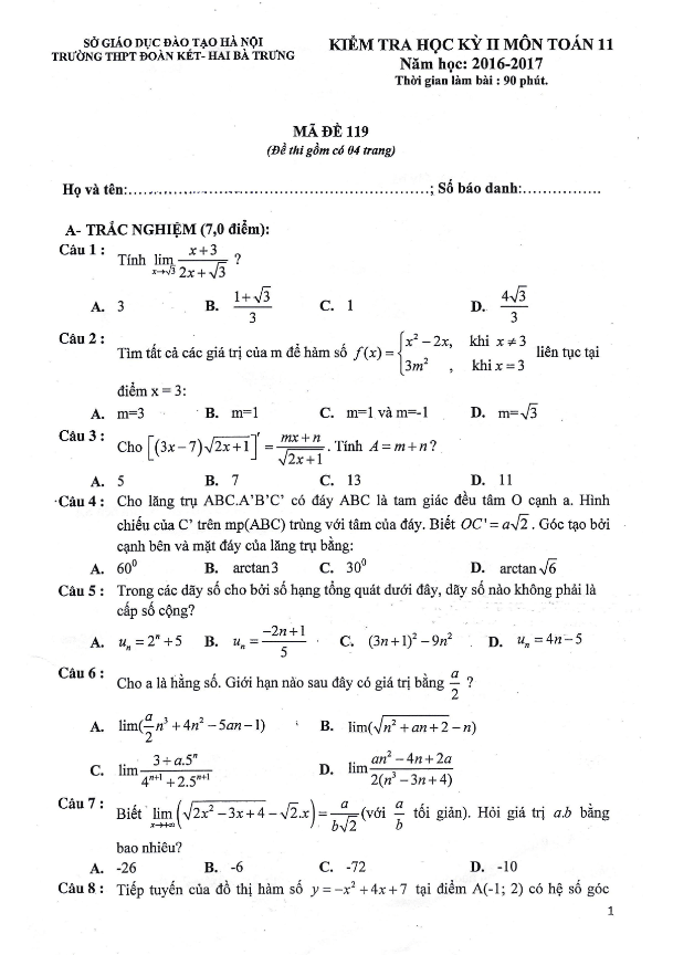 Đề thi HK2 Toán 11 năm học 2016 – 2017 trường THPT Đoàn Kết – Hai Bà Trưng – Hà Nội