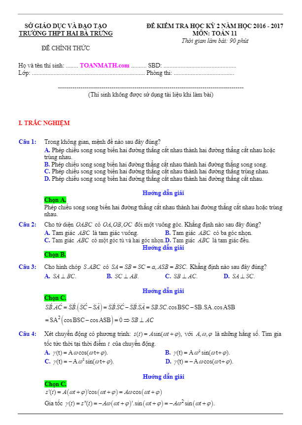 Đề thi HK2 Toán 11 năm học 2016 – 2017 trường THPT Hai Bà Trưng – TT. Huế
