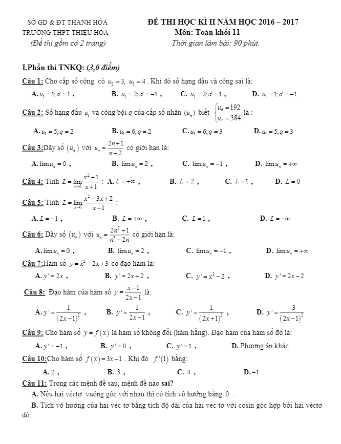Đề thi HK2 Toán 11 năm học 2016 – 2017 trường THPT Thiệu Hóa – Thanh Hóa