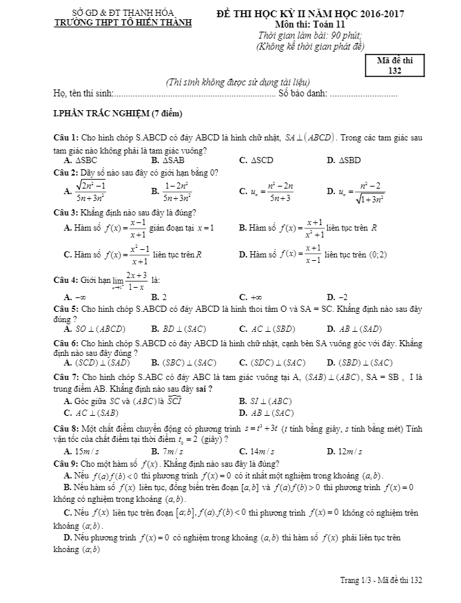 Đề thi HK2 Toán 11 năm học 2016 – 2017 trường THPT Tô Hiến Thành – Thanh Hóa