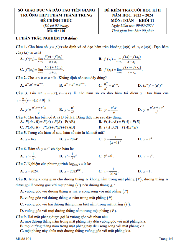 Đề cuối học kì 2 Toán 11 năm 2023 – 2024 trường THPT Phạm Thành Trung – Tiền Giang