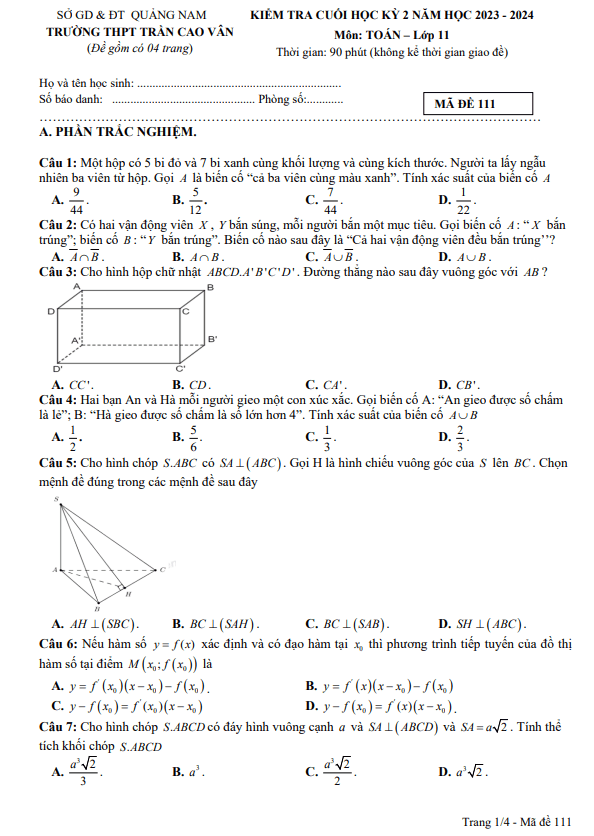 Đề cuối học kỳ 2 Toán 11 năm 2023 – 2024 trường THPT Trần Cao Vân – Quảng Nam