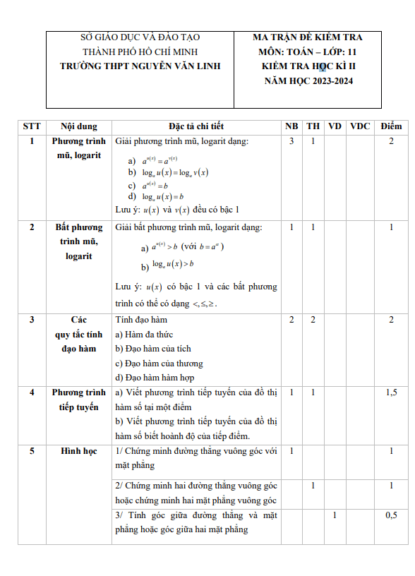 Đề học kì 2 Toán 11 năm 2023 – 2024 trường THPT Nguyễn Văn Linh – TP HCM