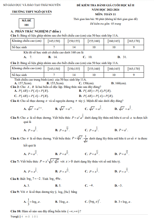 Đề cuối học kì 2 Toán 11 năm 2023 – 2024 trường THPT Ngô Quyền – Thái Nguyên