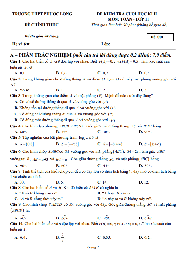 Đề cuối học kì 2 Toán 11 năm 2023 – 2024 trường THPT Phước Long – Bình Phước