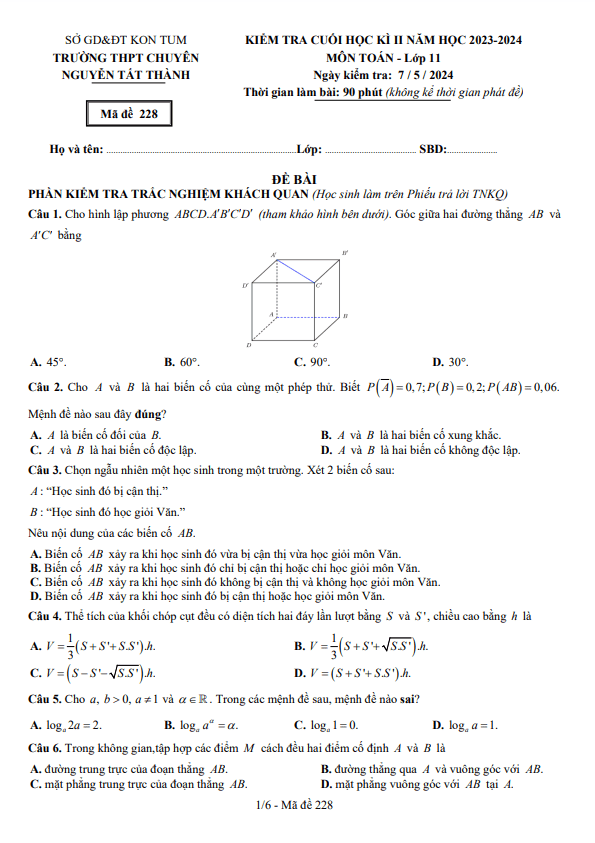 Đề cuối kì 2 Toán 11 năm 2023 – 2024 trường chuyên Nguyễn Tất Thành – Kon Tum