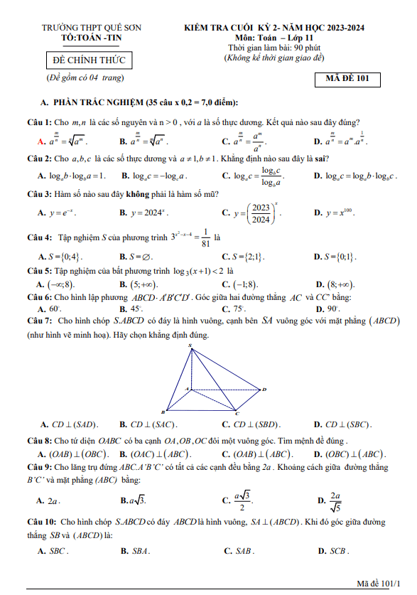 Đề cuối kỳ 2 Toán 11 năm 2023 – 2024 trường THPT Quế Sơn – Quảng Nam