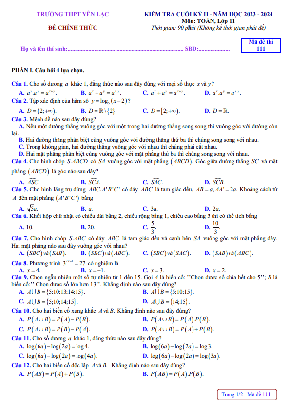 Đề cuối kỳ 2 Toán 11 năm 2023 – 2024 trường THPT Yên Lạc – Vĩnh Phúc