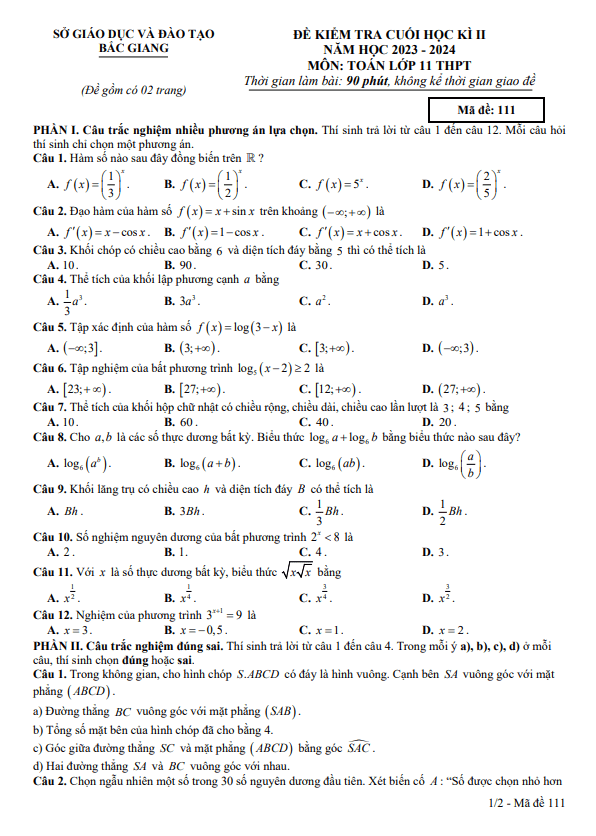 Đề kiểm tra cuối học kì 2 Toán 11 năm 2023 – 2024 sở GD&ĐT Bắc Giang