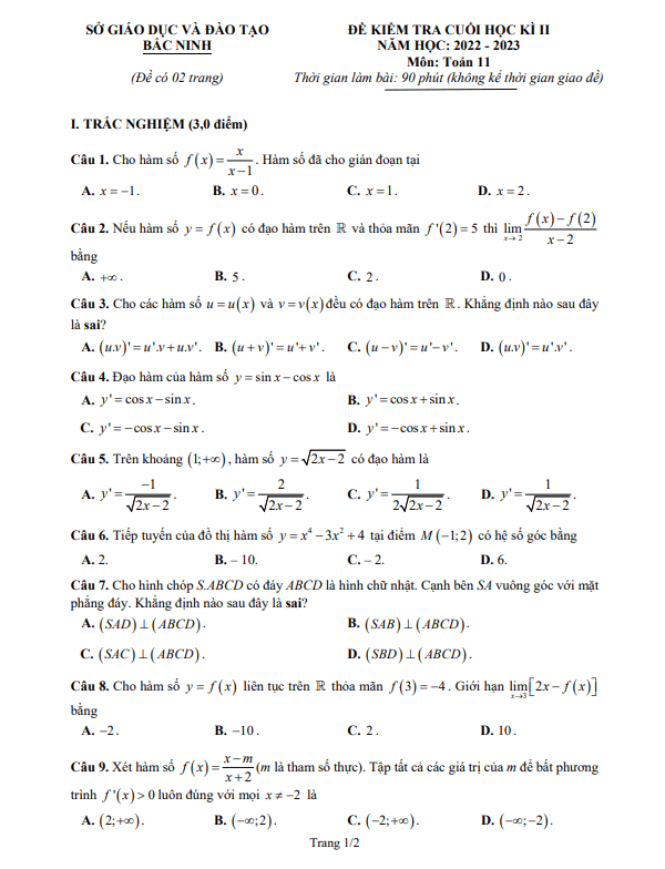 Đề kiểm tra cuối học kỳ 2 Toán 11 năm 2022 – 2023 sở GD&ĐT Bắc Ninh