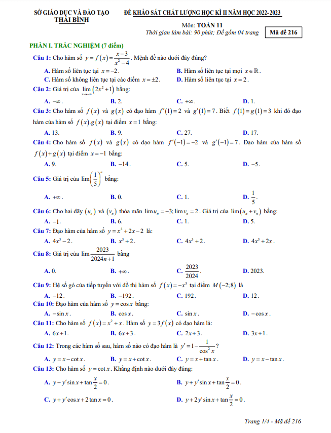 Đề thi học kì 2 Toán 11 năm 2022 – 2023 sở GD&ĐT Thái Bình