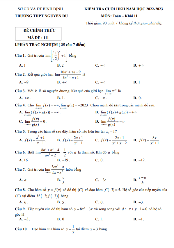 Đề cuối HK2 Toán 11 năm 2022 – 2023 trường THPT Nguyễn Du – Bình Định