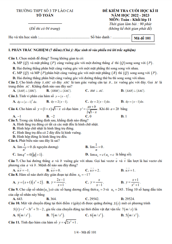 Đề cuối học kì 2 Toán 11 năm 2022 – 2023 trường THPT số 3 TP Lào Cai