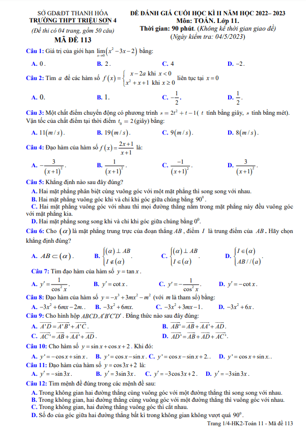 Đề cuối học kì 2 Toán 11 năm 2022 – 2023 trường THPT Triệu Sơn 4 – Thanh Hóa