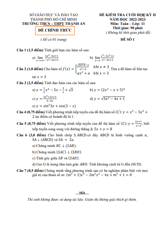 Đề cuối học kỳ 2 Toán 11 năm 2022 – 2023 trường THCS & THPT Thạnh An – TP HCM
