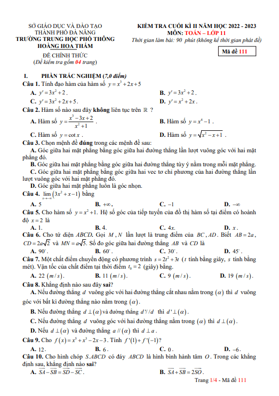 Đề cuối kì 2 Toán 11 năm 2022 – 2023 trường THPT Hoàng Hoa Thám – Đà Nẵng