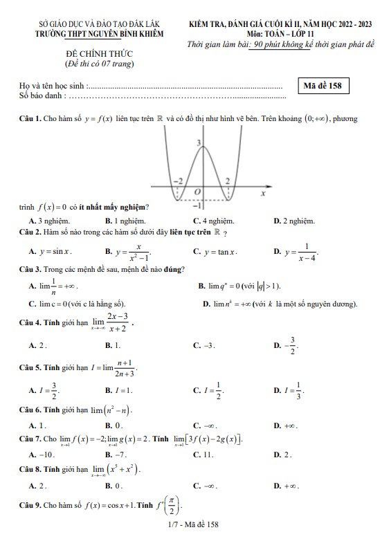 Đề cuối kì 2 Toán 11 năm 2022 – 2023 trường THPT Nguyễn Bỉnh Khiêm – Đắk Lắk