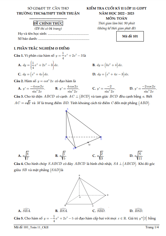 Đề cuối kỳ 2 Toán 11 năm 2022 – 2023 trường Thới Thuận – Cần Thơ