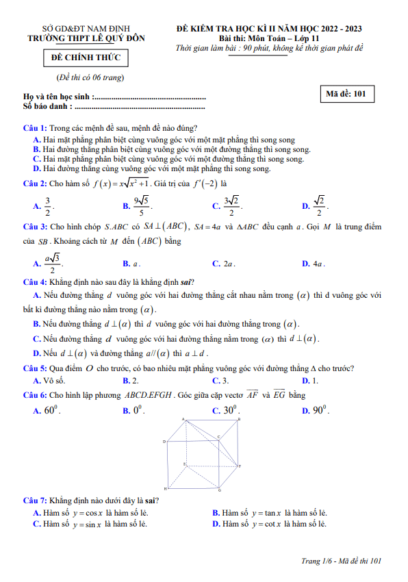 Đề học kì 2 Toán 11 năm 2022 – 2023 trường THPT Lê Quý Đôn – Nam Định
