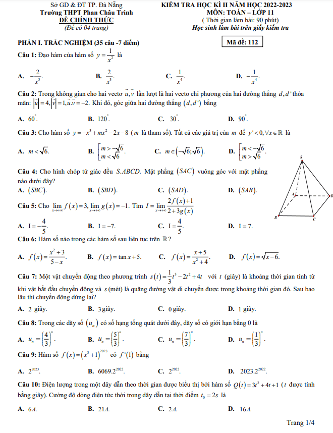 Đề học kì 2 Toán 11 năm 2022 – 2023 trường THPT Phan Châu Trinh – Đà Nẵng