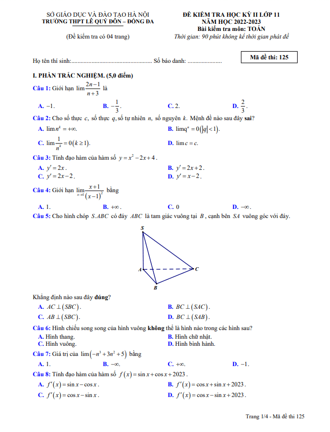 Đề học kỳ 2 Toán 11 năm 2022 – 2023 trường THPT Lê Quý Đôn – Hà Nội