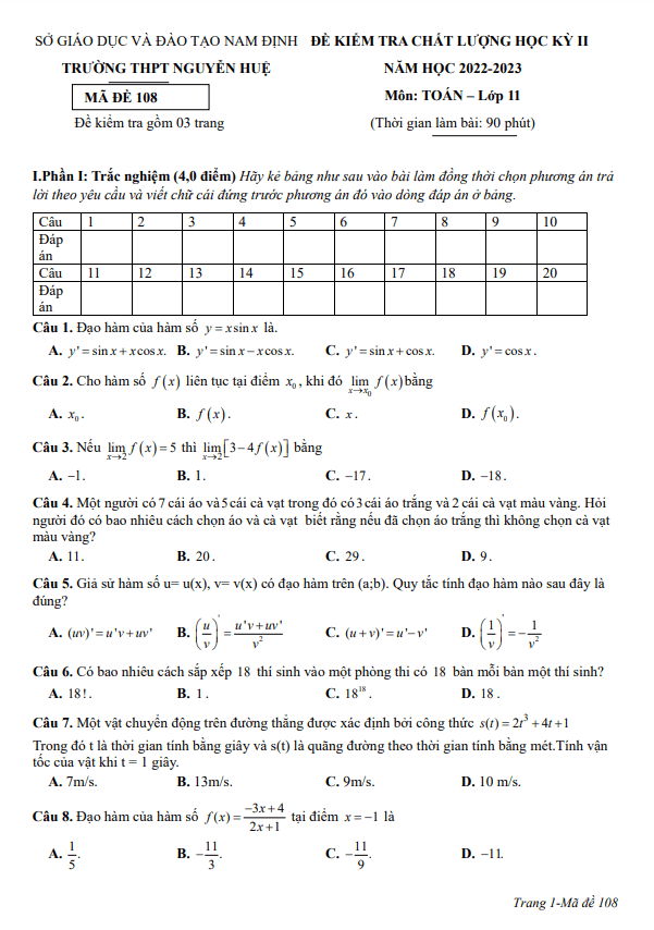 Đề học kỳ 2 Toán 11 năm 2022 – 2023 trường THPT Nguyễn Huệ – Nam Định