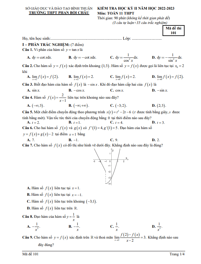 Đề học kỳ 2 Toán 11 năm 2022 – 2023 trường THPT Phan Bội Châu – Bình Thuận