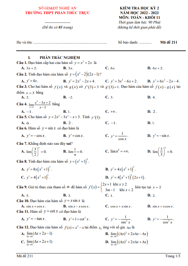 Đề học kỳ 2 Toán 11 năm 2022 – 2023 trường THPT Phan Thúc Trực – Nghệ An