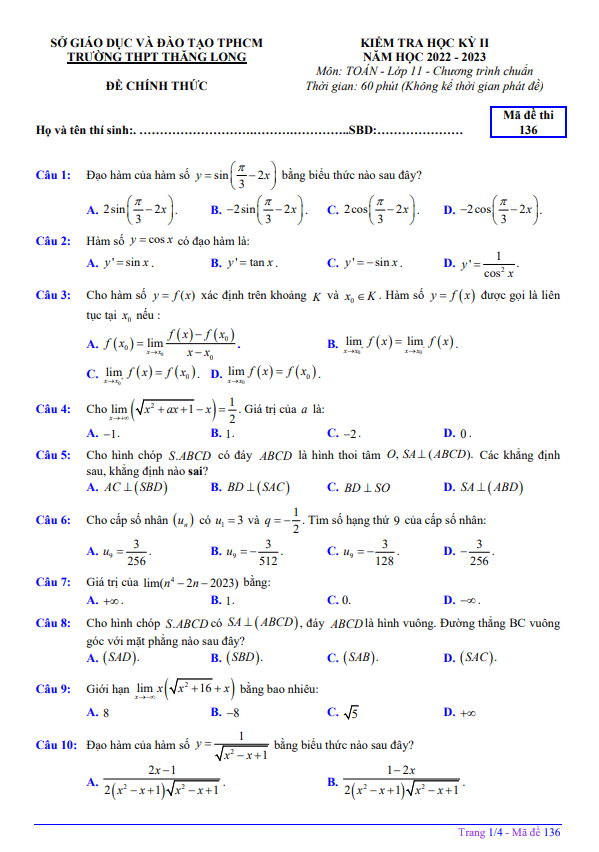 Đề học kỳ 2 Toán 11 năm 2022 – 2023 trường THPT Thăng Long – TP HCM