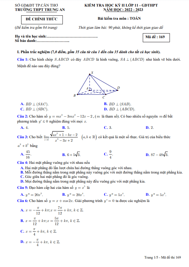 Đề học kỳ 2 Toán 11 năm 2022 – 2023 trường THPT Trung An – Cần Thơ