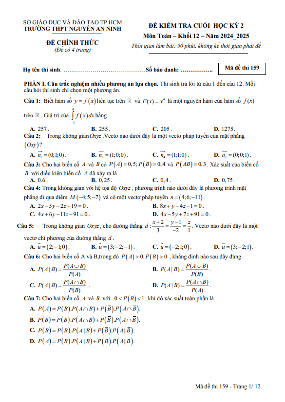 Đề cuối học kỳ 2 Toán 12 năm 2024 – 2025 trường THPT Nguyễn An Ninh – TP HCM