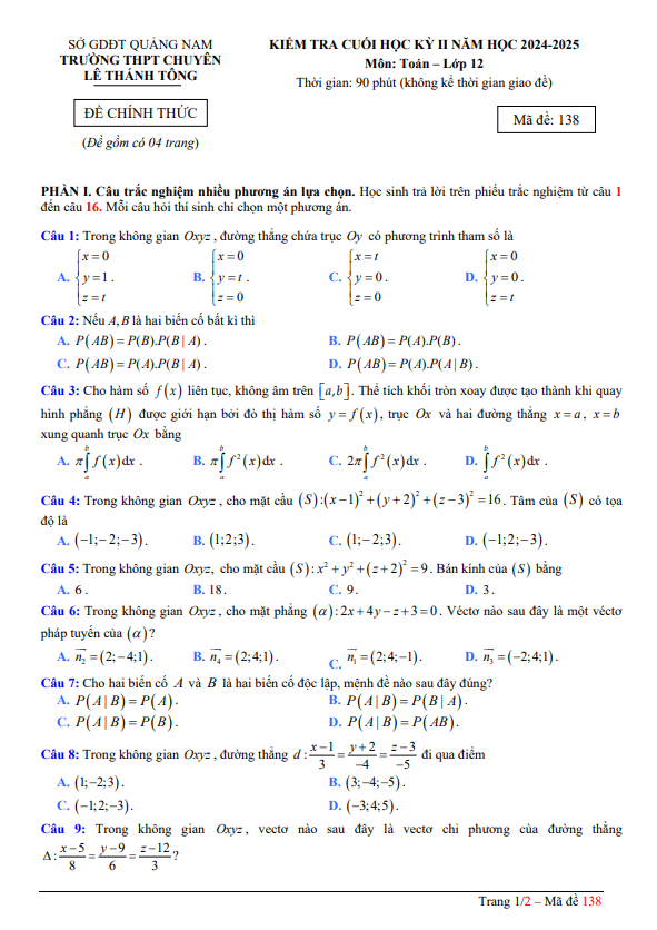 Đề cuối kỳ 2 Toán 12 năm 2024 – 2025 trường chuyên Lê Thánh Tông – Quảng Nam