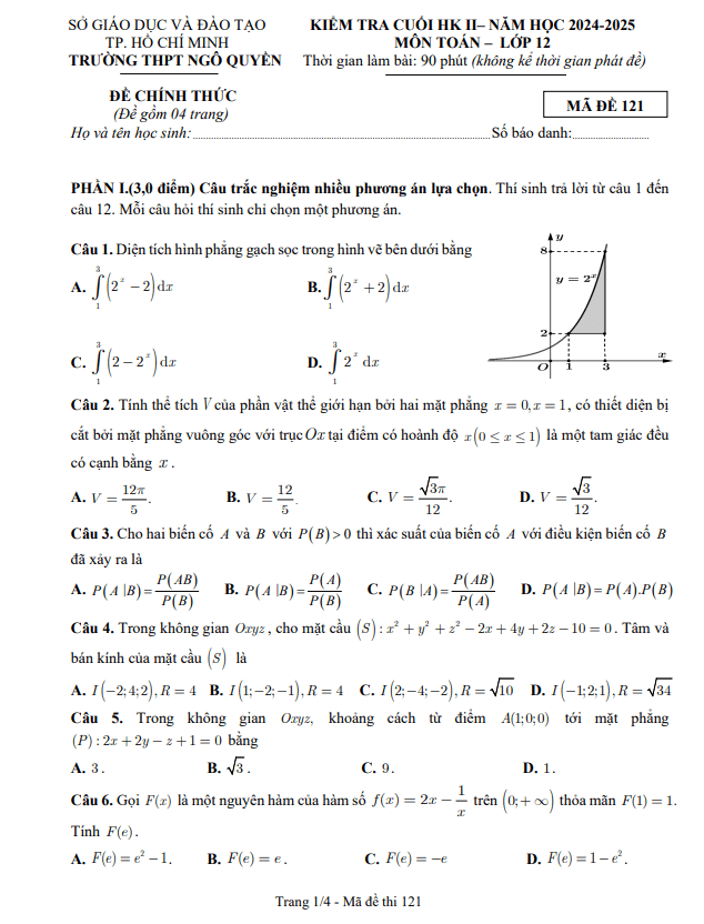 Đề cuối kỳ 2 Toán 12 năm 2024 – 2025 trường THPT Ngô Quyền – TP HCM