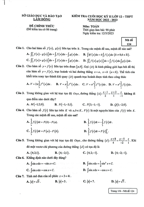 Đề kiểm tra cuối học kỳ 2 Toán 12 năm 2022 – 2023 sở GD&ĐT Lâm Đồng