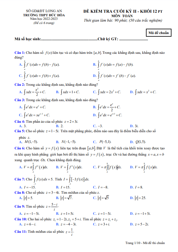 Đề cuối kỳ 2 Toán 12 năm 2022 – 2023 trường THPT Đức Hòa – Long An