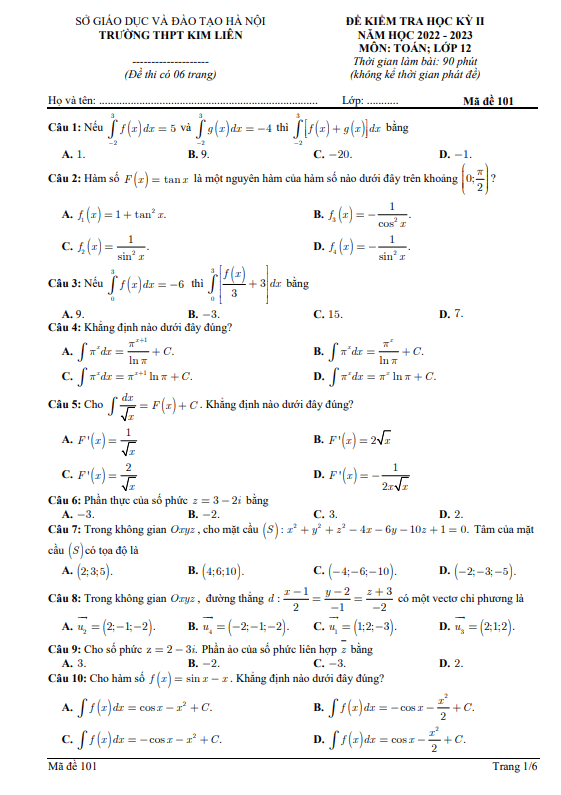 Đề học kỳ 2 Toán 12 năm 2022 – 2023 trường THPT Kim Liên – Hà Nội