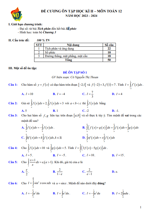 File WORD các ĐỀ THI CUỐI HỌC KÌ 2 TOÁN 12 (nếu có) được đính kèm trong nội dung bài viết, nhằm giúp quý thầy, cô giáo có thể tải xuống miễn phí, phục vụ cho quá trình biên soạn và giảng dạy. Quý thầy, cô giáo và bạn đọc có thể chia sẻ thêm ĐỀ THI CUỐI HỌC KÌ 2 TOÁN 12 bằng cách gửi về địa chỉ email: toanmath.com@gmail.com, nhằm tạo nguồn đề thi phong phú, đa dạng để các em học sinh lớp 12 tham khảo và rèn luyện.