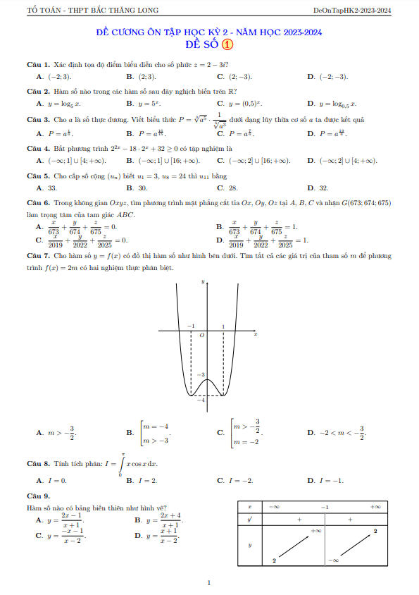05 đề ôn tập HK2 Toán 12 năm 2023 – 2024 trường THPT Bắc Thăng Long – Hà Nội