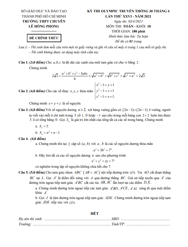 Đề Olympic 30 tháng 4 Toán 10 năm 2021 trường chuyên Lê Hồng Phong – TP HCM