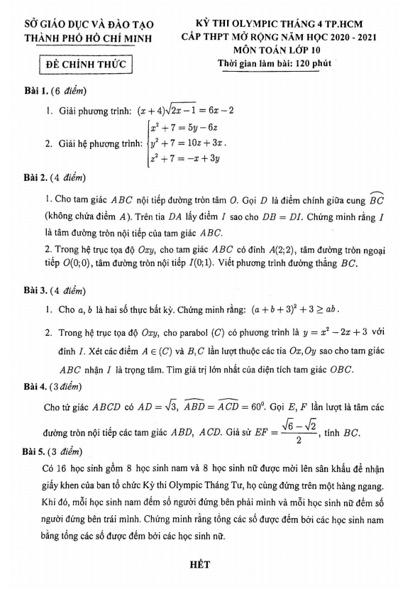Đề Olympic tháng 4 Toán 10 năm 2020 – 2021 sở GD&ĐT TP Hồ Chí Minh
