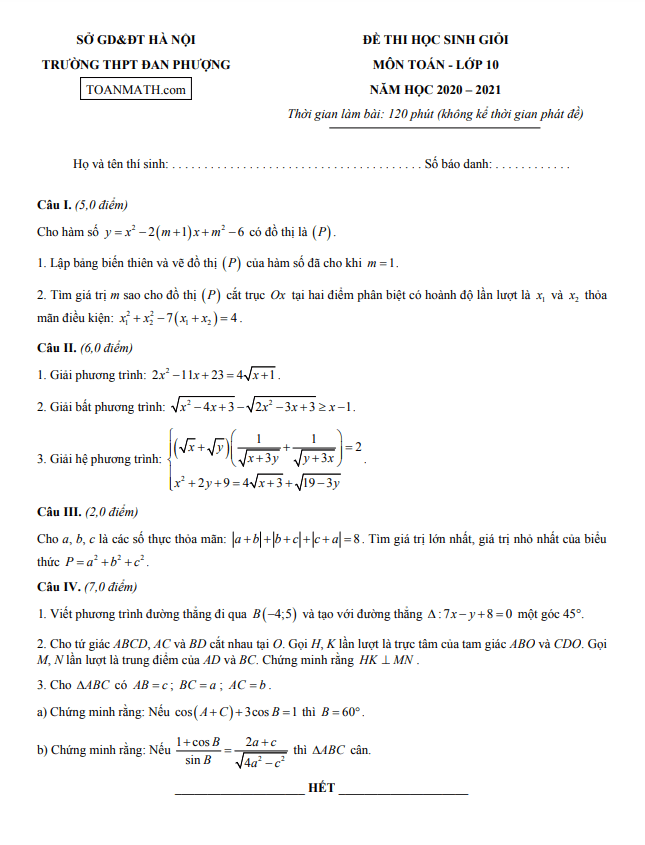Đề thi HSG Toán 10 năm 2020 – 2021 trường THPT Đan Phượng – Hà Nội