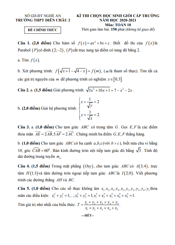 Đề thi HSG Toán 10 năm 2020 – 2021 trường THPT Diễn Châu 2 – Nghệ An