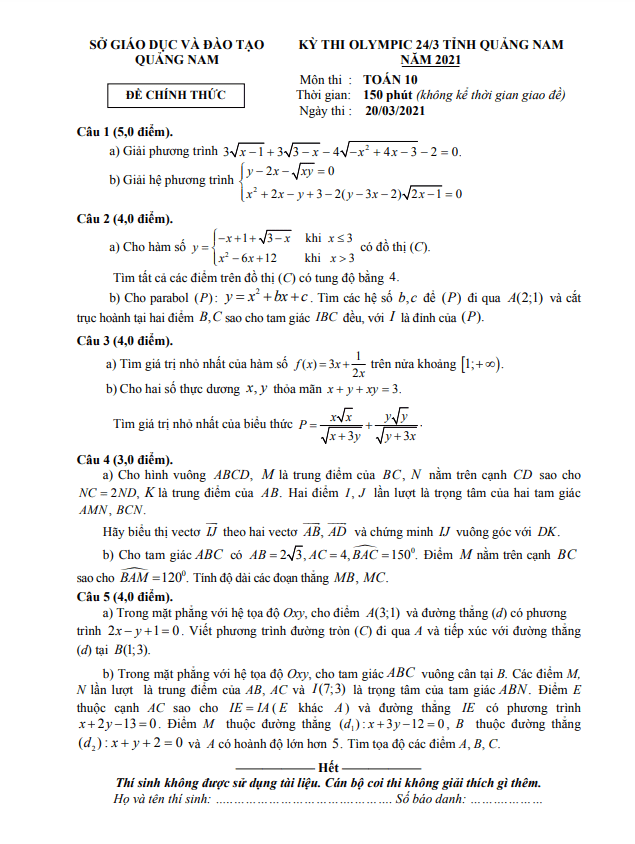 Đề thi Olympic 24/3 Toán 10 năm 2021 sở GD&ĐT Quảng Nam