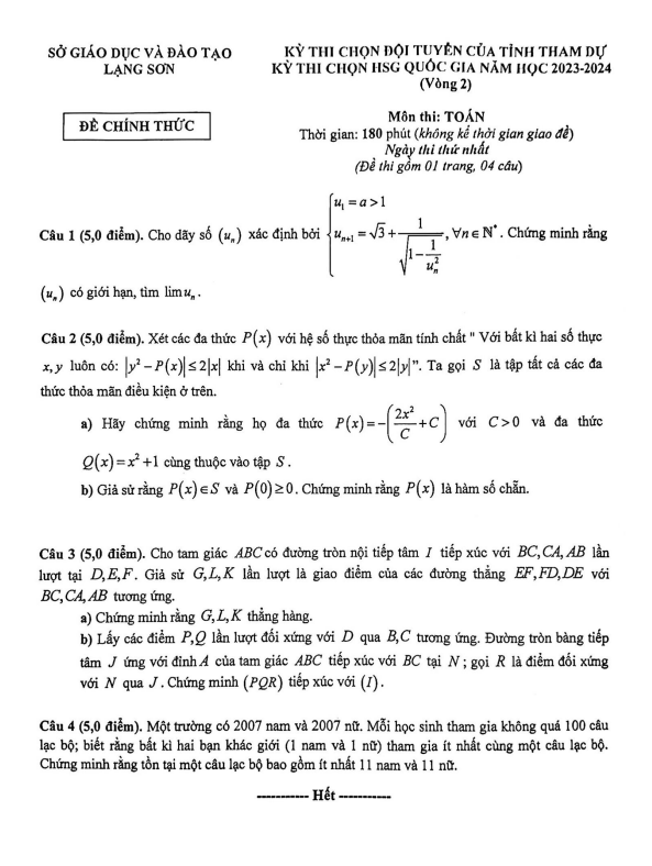 Đề chọn đội tuyển thi HSG QG môn Toán năm 2023 – 2024 sở GD&ĐT Lạng Sơn