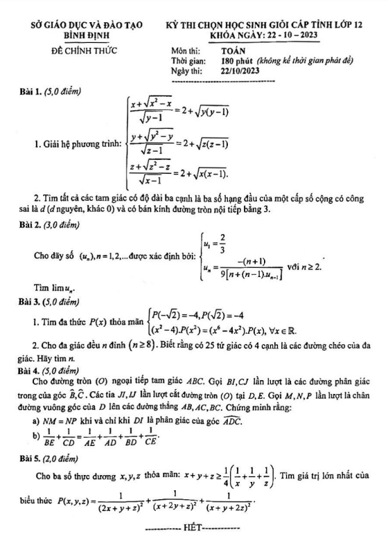 Đề học sinh giỏi cấp tỉnh Toán 12 năm 2023 – 2024 sở GD&ĐT Bình Định