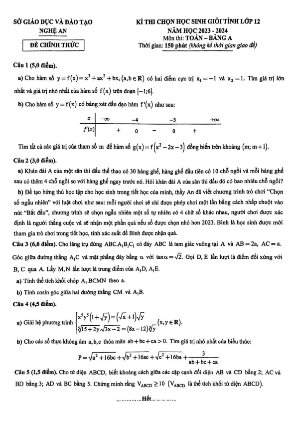 Đề học sinh giỏi tỉnh Toán 12 năm 2023 – 2024 sở GD&ĐT Nghệ An
