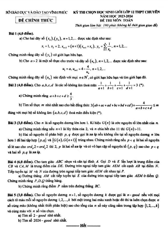 Đề học sinh giỏi Toán 12 chuyên năm 2023 – 2024 sở GD&ĐT Vĩnh Phúc