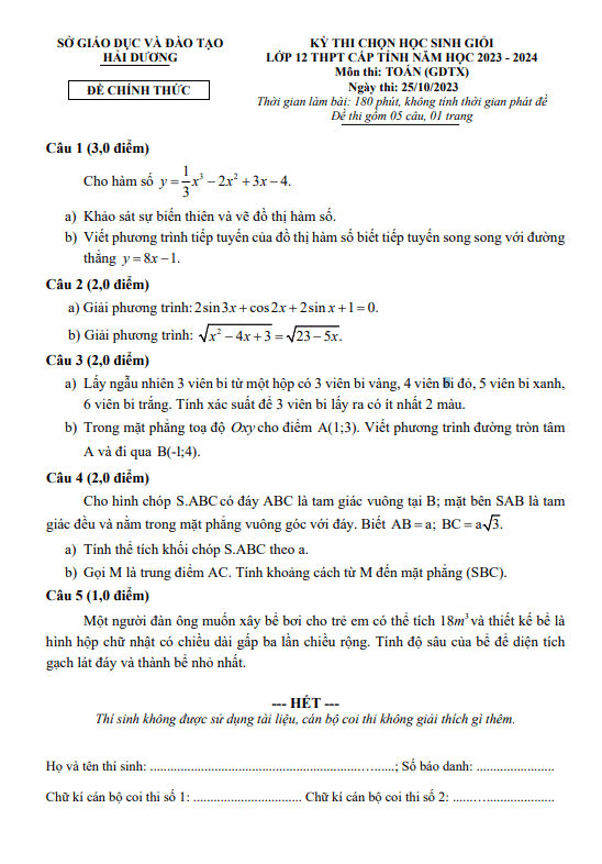 Đề học sinh giỏi Toán 12 GDTX cấp tỉnh năm 2023 – 2024 sở GD&ĐT Hải Dương