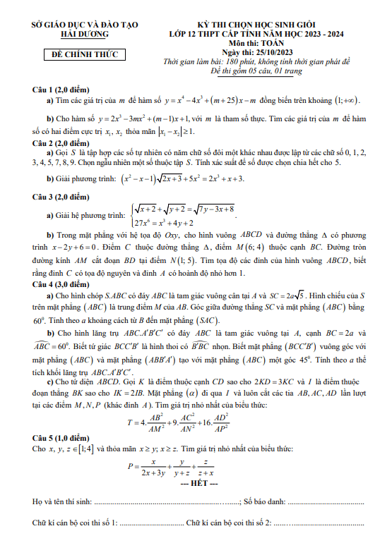 Đề học sinh giỏi Toán 12 THPT cấp tỉnh năm 2023 – 2024 sở GD&ĐT Hải Dương
